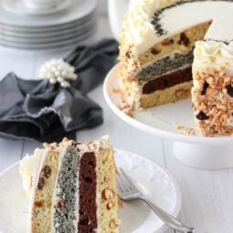 This Royal Layer Cake has four delicious layers—raisin, poppy seed, peanut, and chocolate—plus a creamy butter and sweetened condensed milk frosting. A truly unique and flavorful cake!