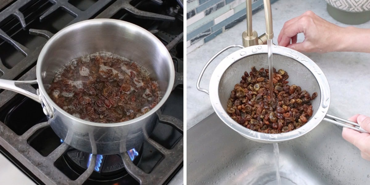 - Place the raisins in a small saucepan and add water. Bring to a boil and cook for 5 minutes. This will soften and plump the raisins. After 5 minutes, drain the water through a fine mesh sieve and rinse the raisins with cool water. Set aside to drain while you prepare the dough.