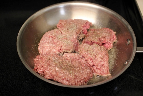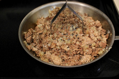 - Heat about ½ a Tablespoon olive oil in a skillet on medium high heat. Add the ground meat. Season the meat with salt and pepper.