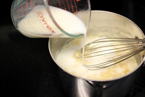 Whisk in the milk and chicken broth. You can use just milk in the sauce, but adding part chicken broth will give it more depth of flavor.