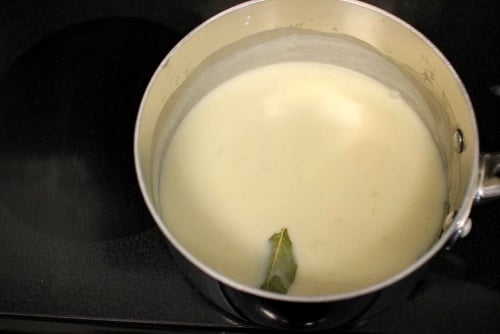 - Add the bay leaf and season with salt and pepper. Cook at a simmer for about 5 minutes, until the sauce thickens. Fish out the bay leaf.