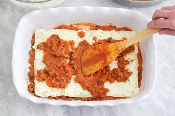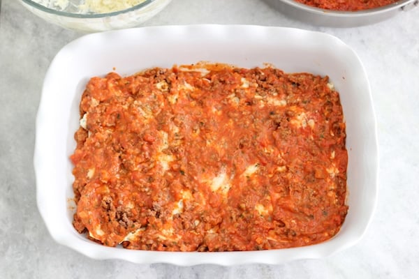 - Top with another ¾ cup of Tomato Meat Sauce and repeat with the rest of the layers, ending with a layer of noodles. You will have 5 layers of noodles total. (If you're using the same pasta as I am, you will use the whole box.)