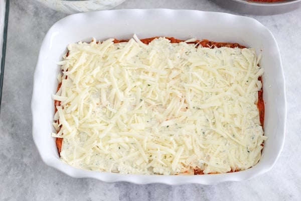 Repeat with the rest of the layers, ending with a layer of noodles. You will have 5 layers of noodles total. (If you're using the same pasta as I am, you will use the whole box.) You can add more grated mozzarella cheese in between the layers, if you'd like.