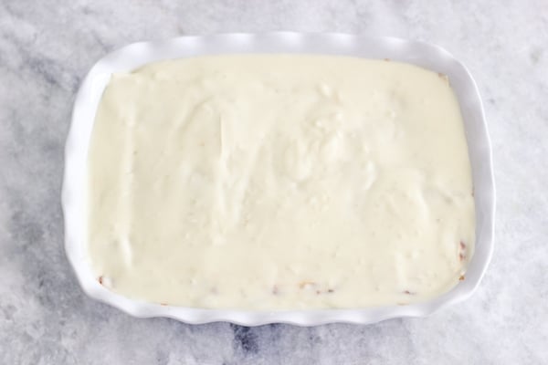 Pour the cheese sauce over the last Lasagna layer and smooth it out.