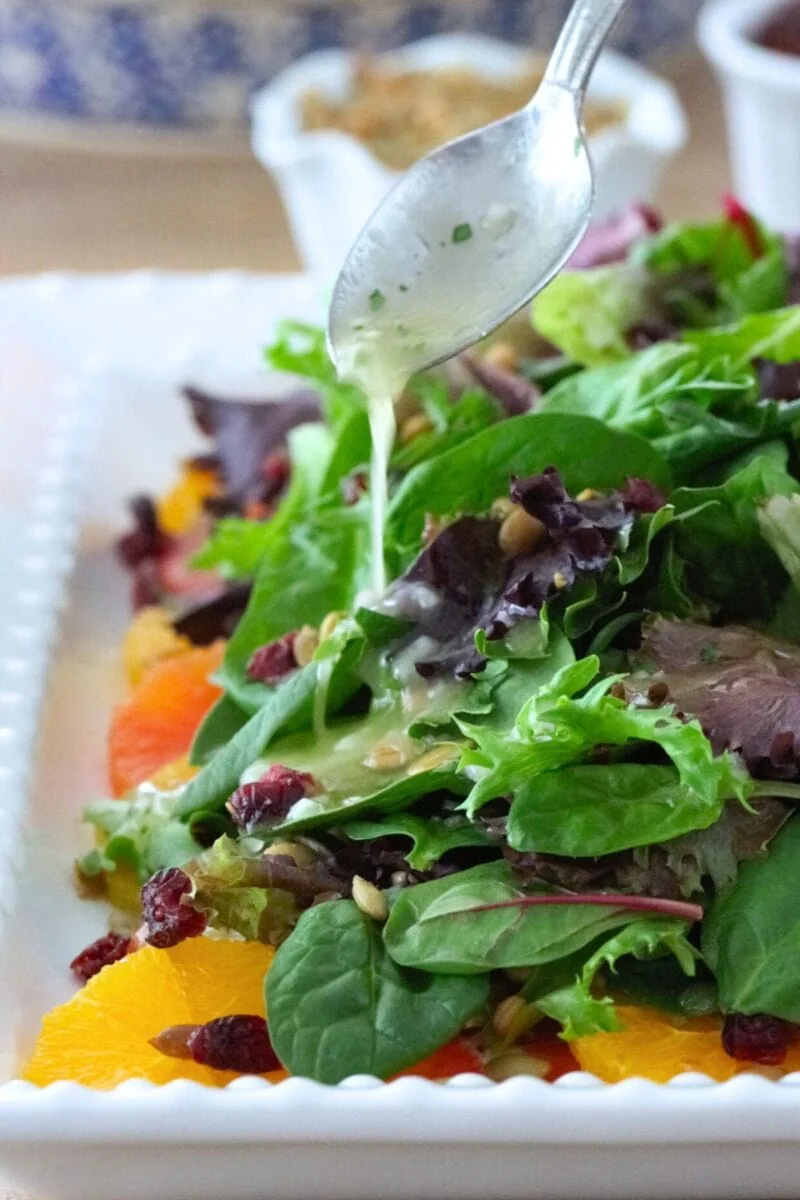 A refreshing and beautiful orange salad with a mix of lettuces, dried cranberries, pepitas, and a tangy orange vinaigrette. Perfect for holiday meals or simple weeknight dinners.