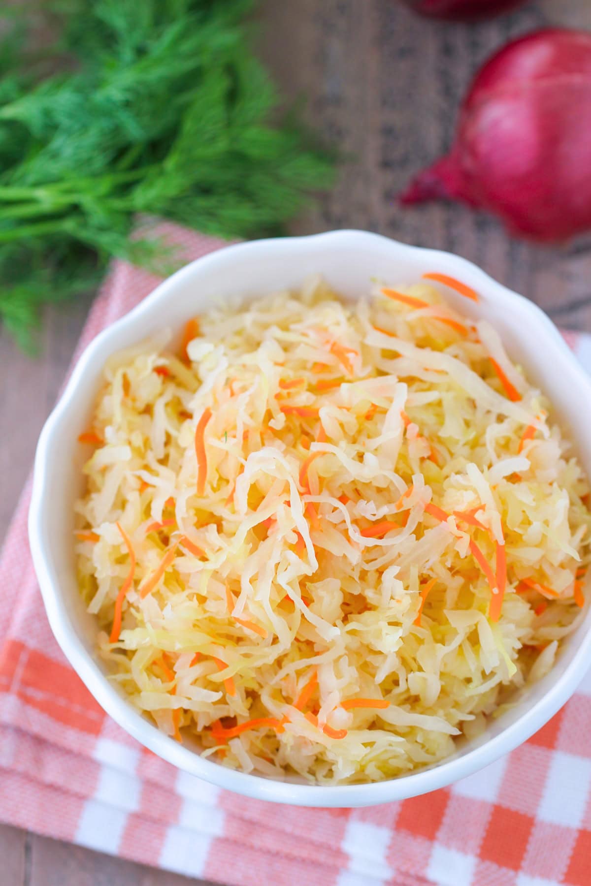 To make a simple sauerkraut salad, I simply season it with salt (if needed) and freshly ground black pepper, a drizzle of olive oil, thinly sliced or finely minced red onion, dill seeds, and fresh herbs, like green onion and dill. Some easy pickled red onions are fantastic in the sauerkraut salad if you have some on hand too. Sometimes, I also add a thinly sliced apple to it for a bit of sweetness.