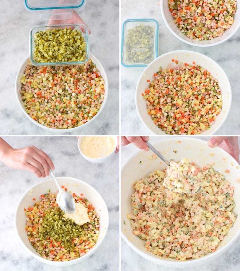 - Finally, mix all the ingredients with the mayonnaise until well combined, and enjoy your delicious Olivier Salad!