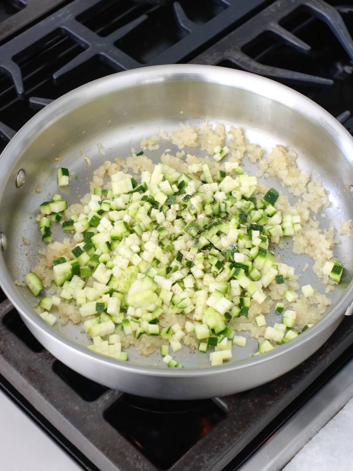 - Add the zucchini to the pan, season with salt and pepper, and cook for another 3 minutes until it starts to soften.