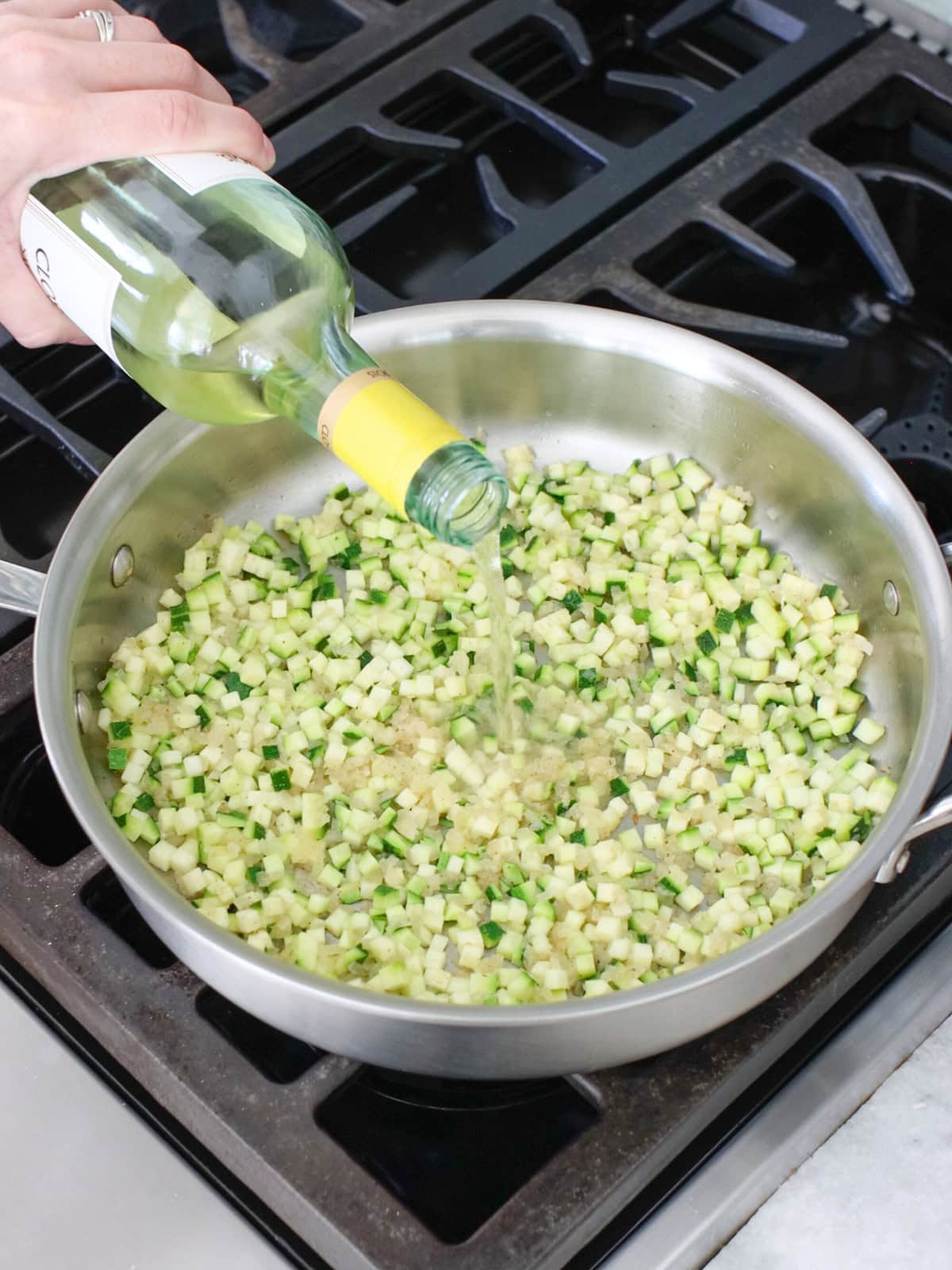 - Step 3: Pour in the wine to deglaze the pan.