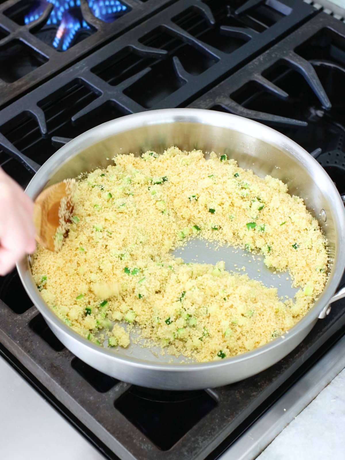 - Step 4: Then stir in the couscous and cook for 3 minutes until lightly toasted.