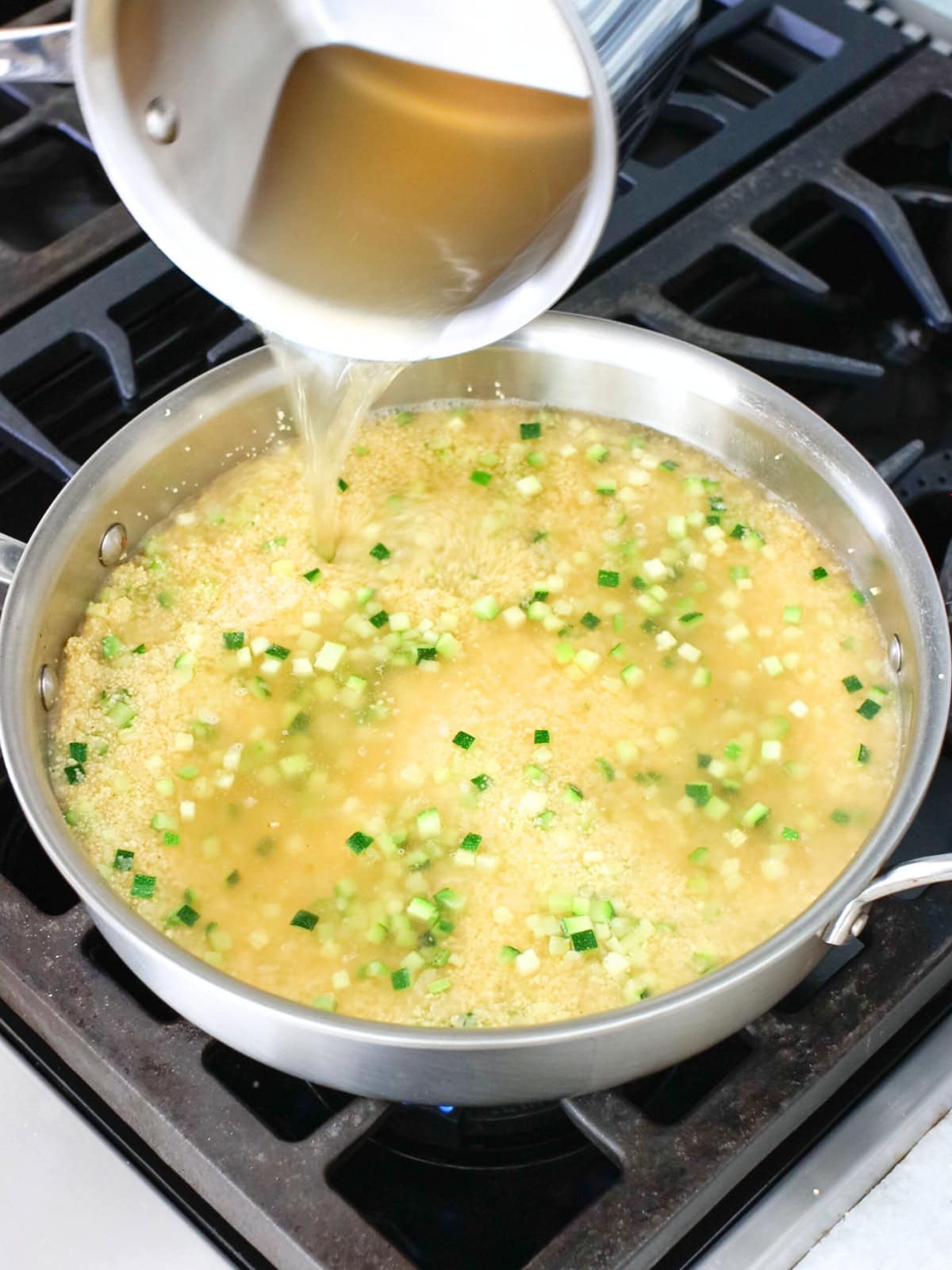 - Now, pour the hot broth into the pan and bring to a boil. (This should happen right away, since the broth is hot.) Remove from heat immediately, cover, and let it sit for 5 minutes, allowing the couscous to absorb the liquid.