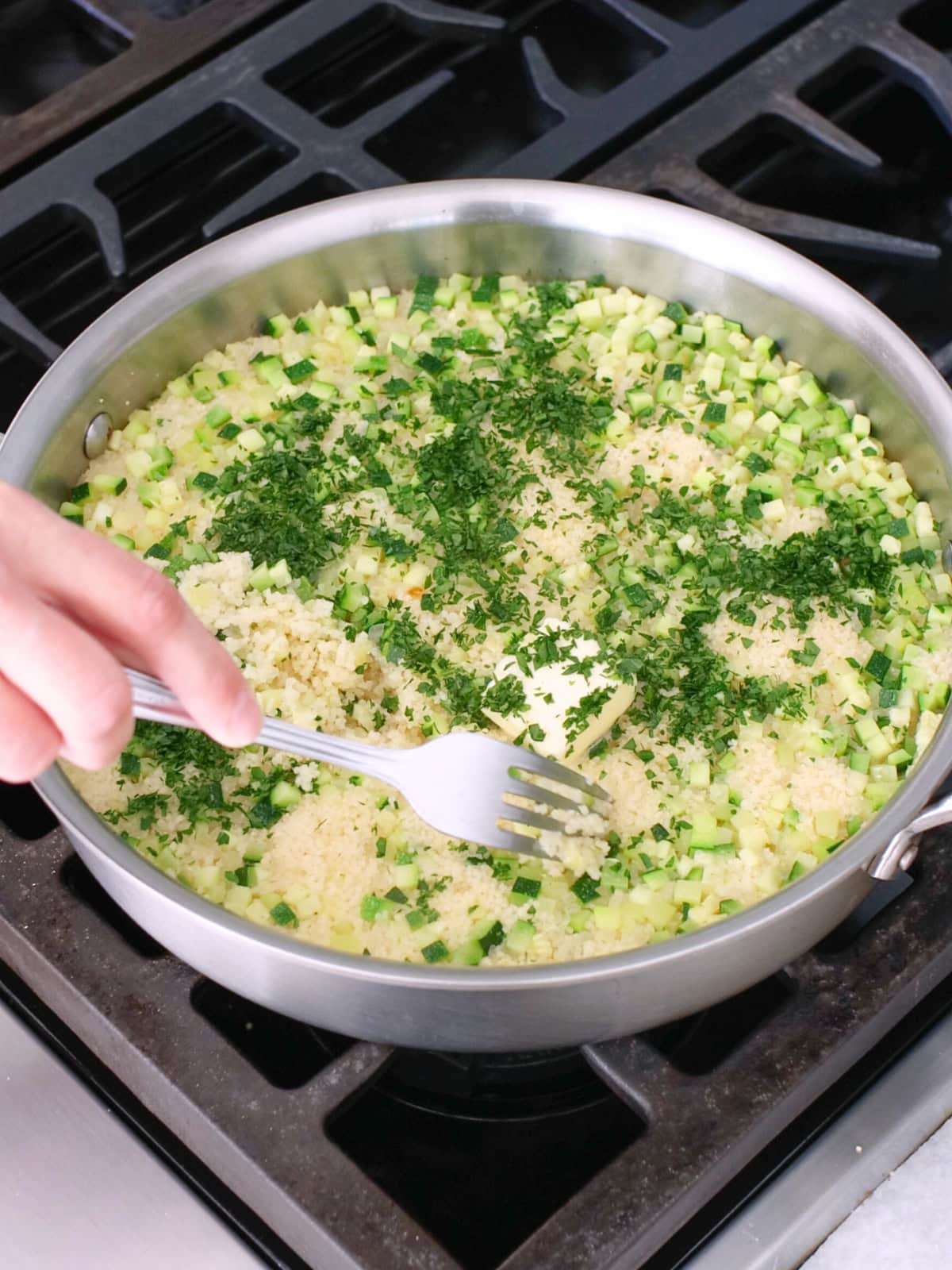 - Lastly, add a pat of butter and fresh herbs, then fluff the couscous with a fork to separate the grains.