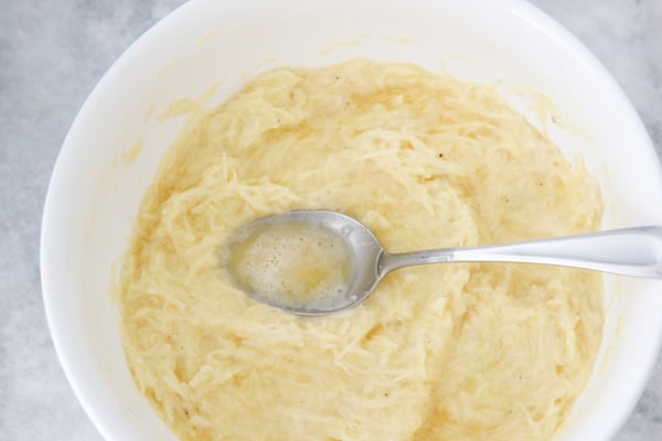 - Add the rest of the ingredients to the potato batter. Add the egg, flour, 1 teaspoon of salt, ground black pepper to the potato mixture. Mix to combine. Use a spoon to remove any excess liquid from the top of the potato mixture.