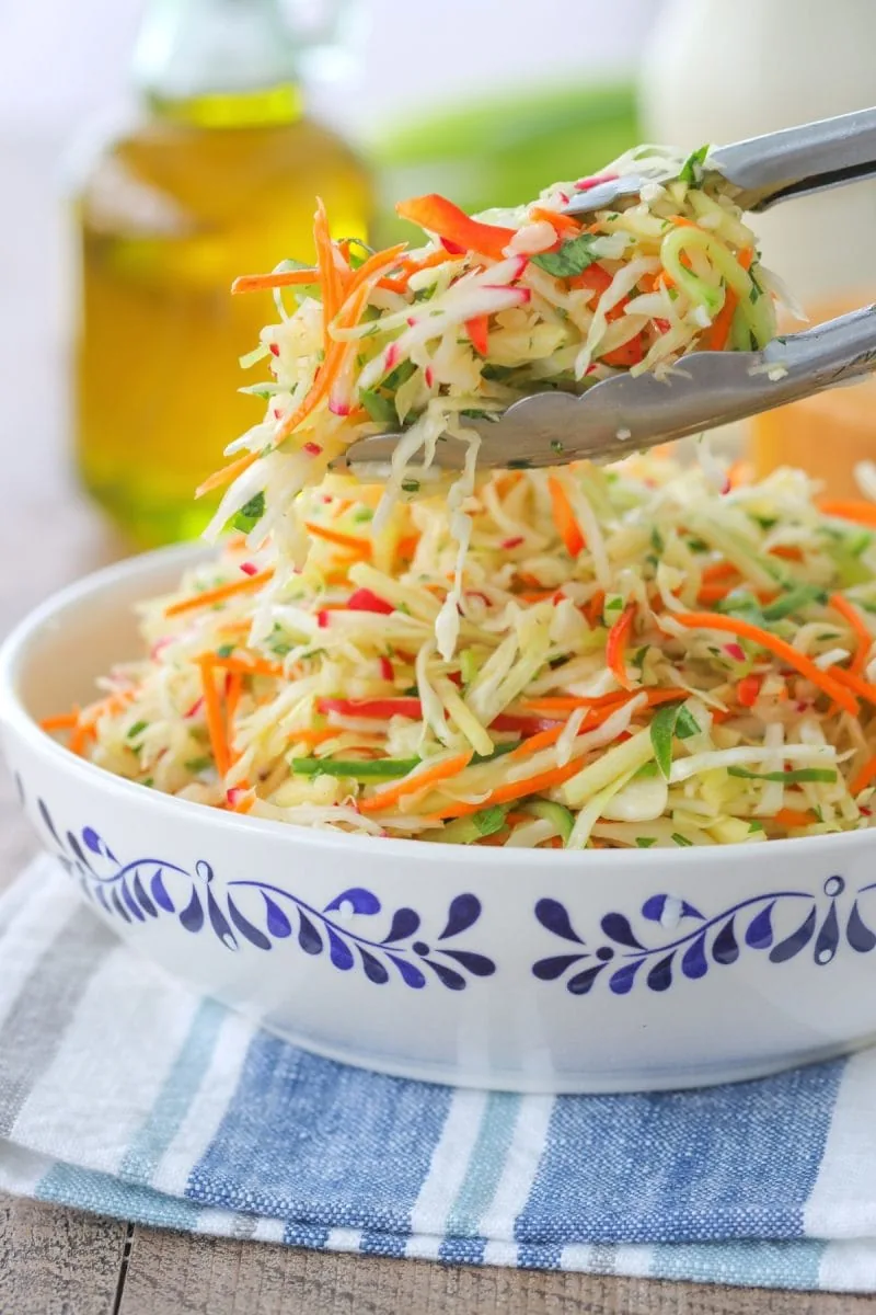 This healthy cabbage salad is packed with so many colorful vegetables and dressed with oil and vinegar instead of a mayo, like in a typical cabbage slaw. It's so delicious and is perfect to serve as a side dish or on top of Fish Tacos, Pulled Chicken Sandwiches and more.
