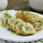 Roll up the chicken breast, starting with the short side, as tightly as you can without squeezing out the filling. Tie it up with kitchen twine.